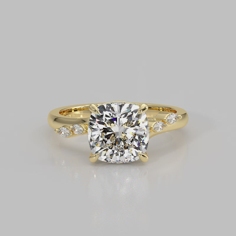 The Madeline Ring features a cushion cut centre diamond set in a refined cathedral setting, framed by a delicately twisted band adorned with marquise accent stones. The sculpted band creates a soft sense of movement, drawing the eye toward the centre stone while adding subtle brilliance along the shoulders. Designed for those who appreciate thoughtful detail, timeless form, and understated luxury.