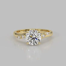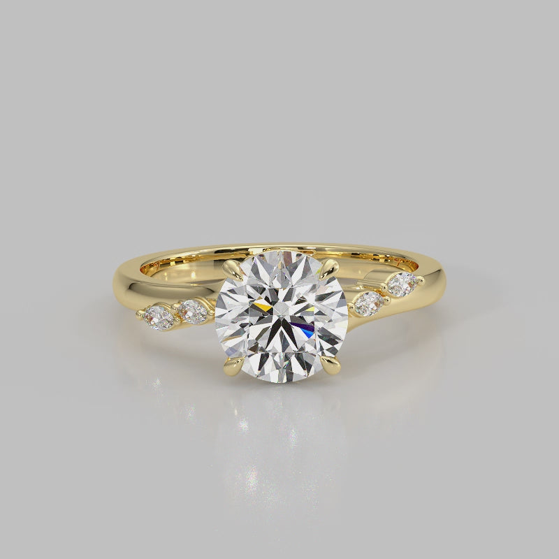 The Madeline Ring features a round cut centre diamond set in a refined cathedral setting, framed by a delicately twisted band adorned with marquise accent stones. The sculpted band creates a soft sense of movement, drawing the eye toward the centre stone while adding subtle brilliance along the shoulders. Designed for those who appreciate thoughtful detail, timeless form, and understated luxury.