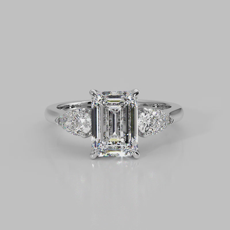The Vivienne Ring features an emerald cut centre diamond, accompanied by two perfectly proportioned pear cut side stones, together representing the past, the present and the future.